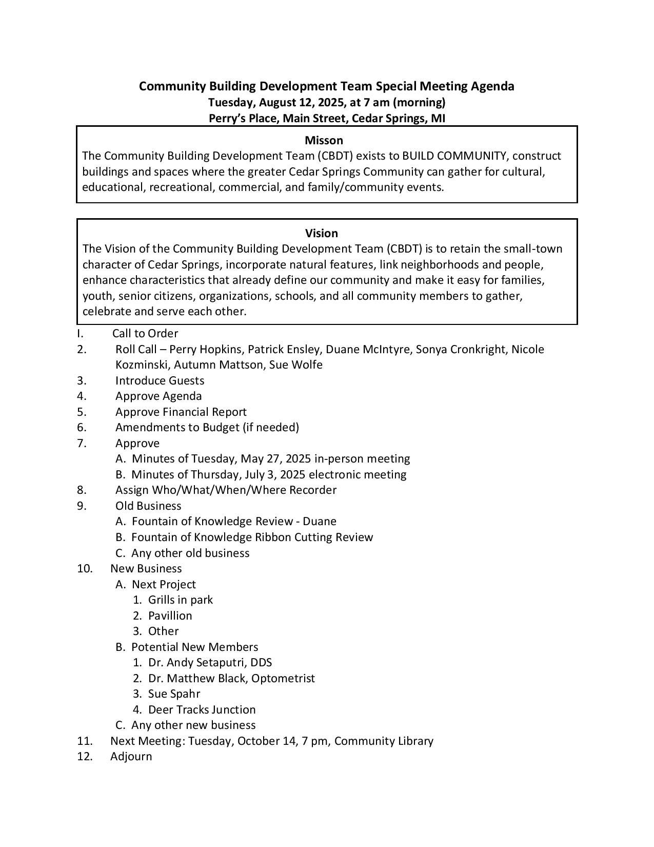 Community Building Development Team Special Meeting Agenda
