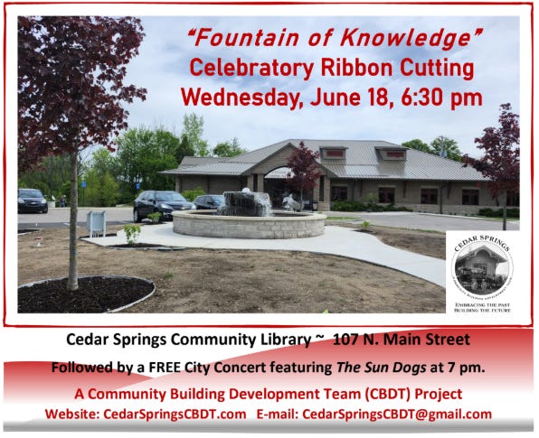 Cedar Springs Library, Fountain of Knowledge, June 18, 2025 at 6:30 pm